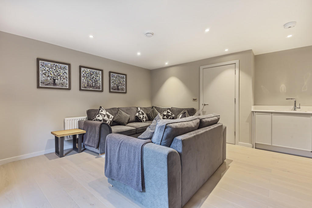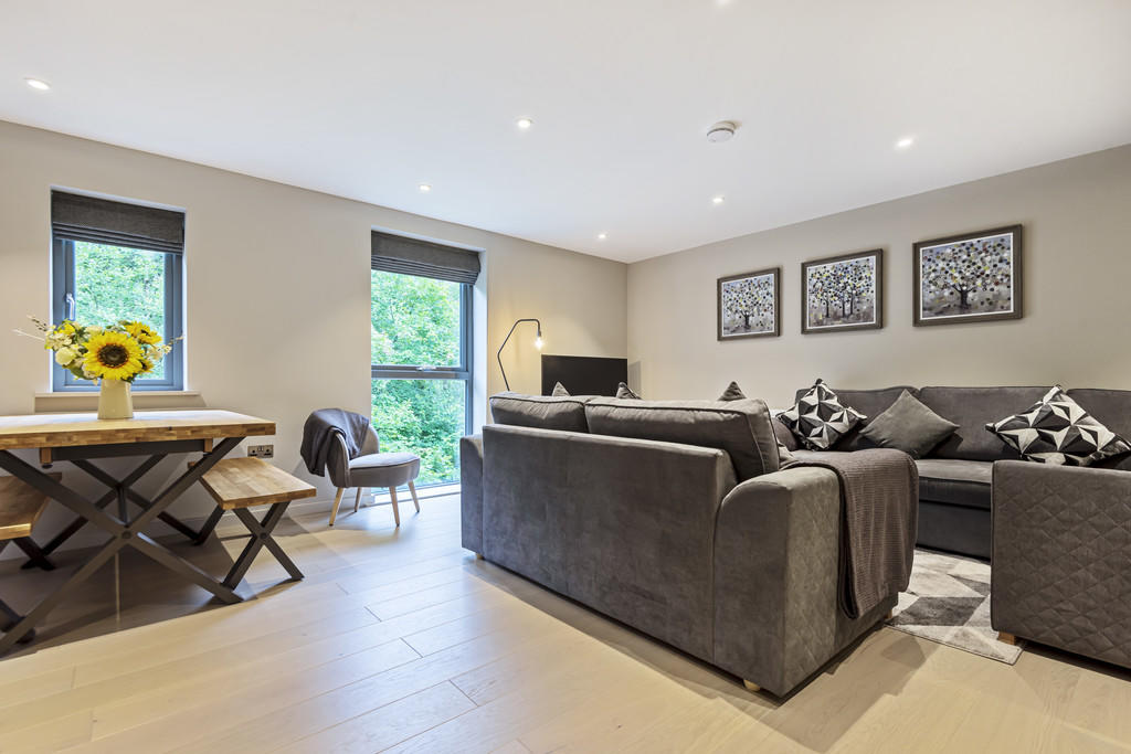 Second-floor open-plan living space with kitchen, dining area and sitting area